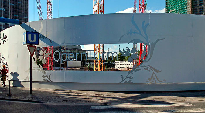 Für die Baustelle des Frankfurter Opernturms (Architekt Christoph Mäckler) wurde im Rahmen des Gebäudemarketing ein außergewöhnlicher Bauzaun entwickelt. Neben Werbeträger für den Bauherren ist der Bauzaun Bildträger für graphische Ornamente, die sich aus der Umgebung ableiten. Teile der Ornamente wachsen über die Trägerfläche hinaus oder umrahmen transparente Flächen, die einen Durchblick auf das Geschehen der Baustelle bieten. Konstruktion: Alu-Fachwerkstützen mit horizontalen Aluminium-Rechteckprofilen Plattenmaterial: Dibond mit Makrolonflächen, Graphik aus Hochleistungs-PVC-Folien Konstruktion, Ausschreibung und Bauleitung durch hfa. |