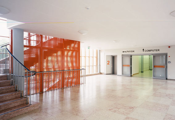 Erweiterungsbau naturwissenschaftliche Fachräume, Bibliothek, Mensa Die Schillerschule in Frankfurt Sachsenhausen besteht aus einem Altbau von 1908 der im Krieg stark zerstört wurde. In den 50er Jahren wurde der westliche Teil der Schule instandgesetzt während der östliche Teil durch einen Neubau ersetzt wurde. Im Rahmen der 2006 beschlossenen Gesamtsanierung der Schule wurde der östliche Teil um einen viergeschossigen Anbau auf der Hofseite mit neuen naturwissen-schaftlichen Fachräumen sowie einer Bibliothek erweitert. Der Ostflügel hat darüber hinaus eine Grundsanierung, brandschutztechnische Verbesserungen, eine moderne Raumakustik sowie ein neues Beleuchtungskonzept erhalten. Die neue Mitte der Schule ist die im Erdgeschoss des Neubaus errichtete Bibliothek mit ihren großen Glasflächen zum Hof sowie einer Innenverglasung zu den Räumen der Verwaltung und der Schulleitung. Die Schule erhielt eine Mensa mit Mischküche für die Mittagsversorgung von 600 Schülern. Die umgebauten Räumen des Untergeschosses im Ostflügel bieten mit den Speiseräumen und einer kleinen Südterrasse den Schülern eine zusätzliche Aufenthaltsmöglichkeit, insbesondere während des Nachmittagsunterrichts. Das Farbkonzept wird von hellen Wandfarben, Holzeinbauten, Erdtönen in den Bodenbelägen sowie einzelnen, bereichsweise eingesetzten Farbflächen in Orangetönen geprägt. In den drei oberen Geschossen des Neubaus sind die Unterrichtseinheiten für Biologie (1.OG), Physik (2.OG) und Chemie (3.OG) untergebracht. Eine raumhohe Glasfassade mit Brüstungsfeldern aus transluzenter Wärmedämmung bildet den Raumabschluss zum Hof. |