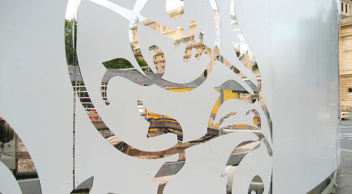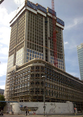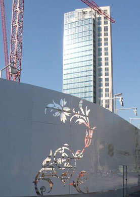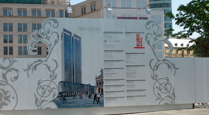 Für die Baustelle des Frankfurter Opernturms (Architekt Christoph Mäckler) wurde im Rahmen des Gebäudemarketing ein außergewöhnlicher Bauzaun entwickelt. Neben Werbeträger für den Bauherren ist der Bauzaun Bildträger für graphische Ornamente, die sich aus der Umgebung ableiten. Teile der Ornamente wachsen über die Trägerfläche hinaus oder umrahmen transparente Flächen, die einen Durchblick auf das Geschehen der Baustelle bieten. Konstruktion: Alu-Fachwerkstützen mit horizontalen Aluminium-Rechteckprofilen Plattenmaterial: Dibond mit Makrolonflächen, Graphik aus Hochleistungs-PVC-Folien Konstruktion, Ausschreibung und Bauleitung durch hfa. |