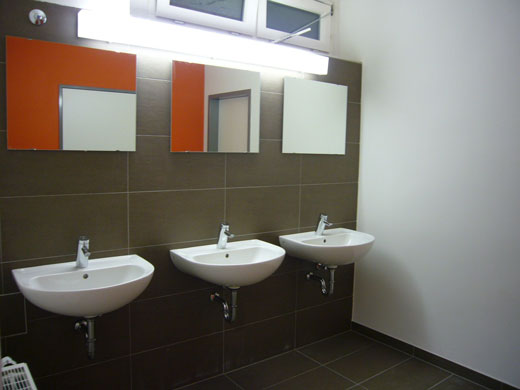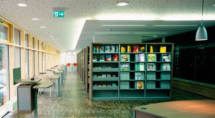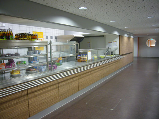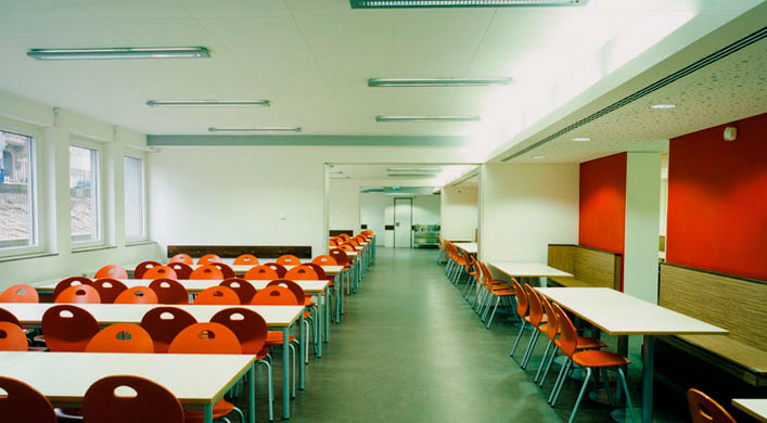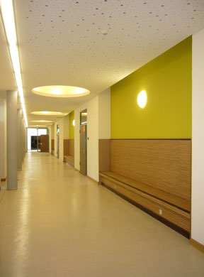 Erweiterungsbau naturwissenschaftliche Fachräume, Bibliothek, Mensa Die Schillerschule in Frankfurt Sachsenhausen besteht aus einem Altbau von 1908 der im Krieg stark zerstört wurde. In den 50er Jahren wurde der westliche Teil der Schule instandgesetzt während der östliche Teil durch einen Neubau ersetzt wurde. Im Rahmen der 2006 beschlossenen Gesamtsanierung der Schule wurde der östliche Teil um einen viergeschossigen Anbau auf der Hofseite mit neuen naturwissen-schaftlichen Fachräumen sowie einer Bibliothek erweitert. Der Ostflügel hat darüber hinaus eine Grundsanierung, brandschutztechnische Verbesserungen, eine moderne Raumakustik sowie ein neues Beleuchtungskonzept erhalten. Die neue Mitte der Schule ist die im Erdgeschoss des Neubaus errichtete Bibliothek mit ihren großen Glasflächen zum Hof sowie einer Innenverglasung zu den Räumen der Verwaltung und der Schulleitung. Die Schule erhielt eine Mensa mit Mischküche für die Mittagsversorgung von 600 Schülern. Die umgebauten Räumen des Untergeschosses im Ostflügel bieten mit den Speiseräumen und einer kleinen Südterrasse den Schülern eine zusätzliche Aufenthaltsmöglichkeit, insbesondere während des Nachmittagsunterrichts. Das Farbkonzept wird von hellen Wandfarben, Holzeinbauten, Erdtönen in den Bodenbelägen sowie einzelnen, bereichsweise eingesetzten Farbflächen in Orangetönen geprägt. In den drei oberen Geschossen des Neubaus sind die Unterrichtseinheiten für Biologie (1.OG), Physik (2.OG) und Chemie (3.OG) untergebracht. Eine raumhohe Glasfassade mit Brüstungsfeldern aus transluzenter Wärmedämmung bildet den Raumabschluss zum Hof. |